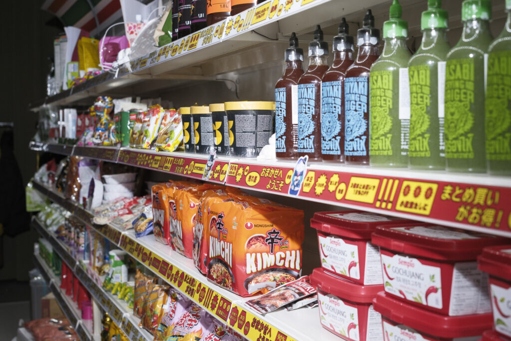 Rot leuchtende Teriyaki-Ingwer-Flaschen reihen sich aneinander, daneben eine scharfe Gochujang-Paste aus Korea. Es gibt japanisches Bier und natürlich Sake. Jemand reicht uns köstliche Sandwiches.